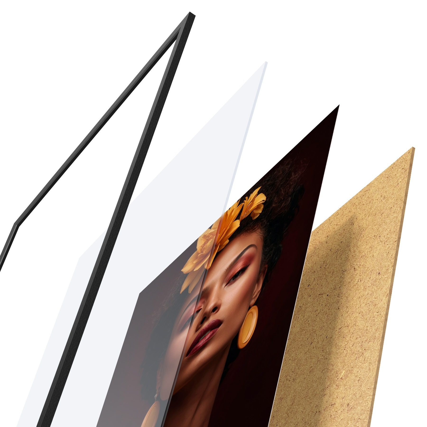 Le poster se compose d'un cadre, d'un plexiglas, d'une image imprimée et d'un support en aggloméré. Le poster peut être immédiatement accroché au mur grâce aux fixations au dos.