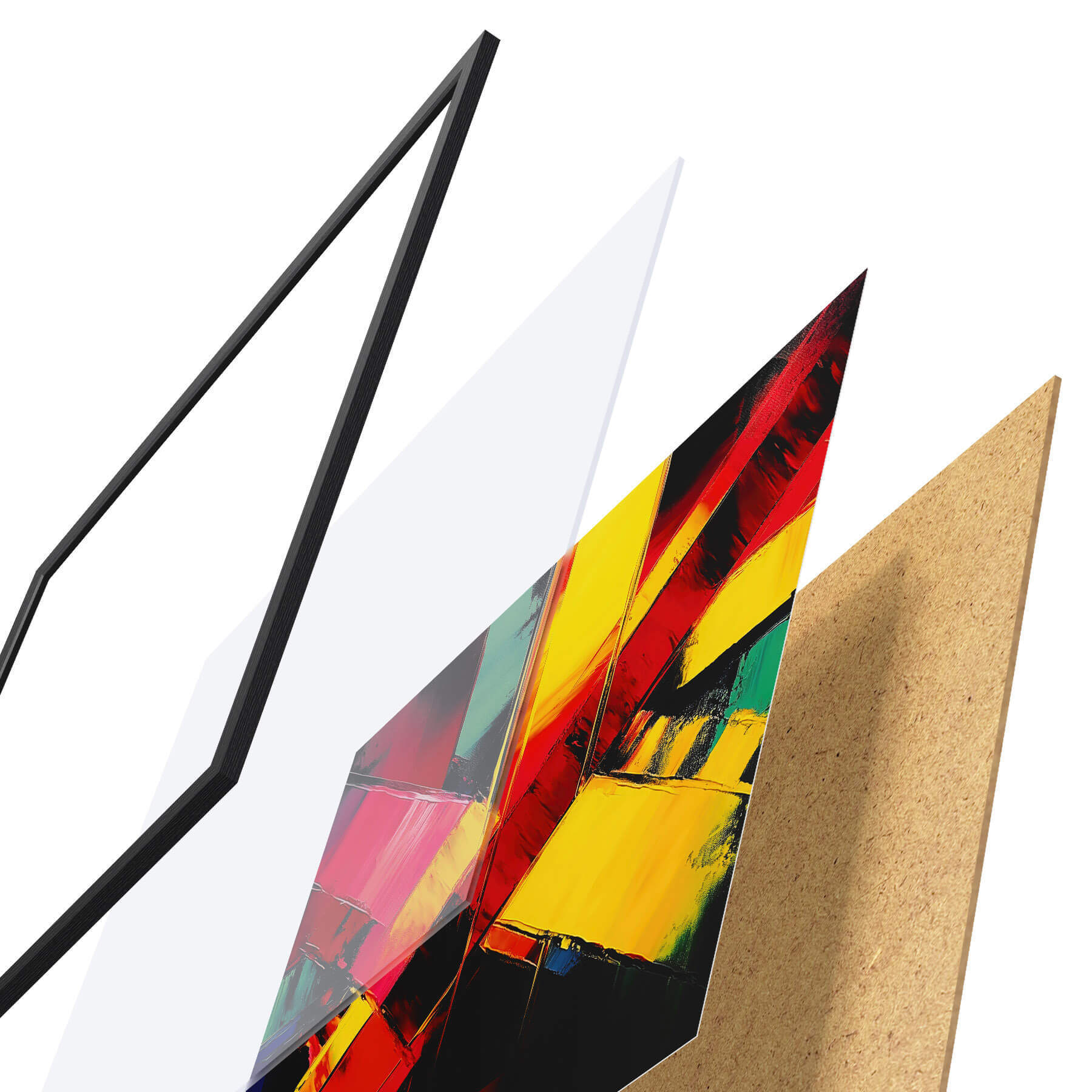 Le poster se compose d'un cadre, d'un plexiglas, d'une image imprimée et d'un support en aggloméré. Le poster peut être immédiatement accroché au mur grâce aux fixations au dos.
