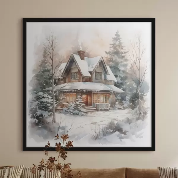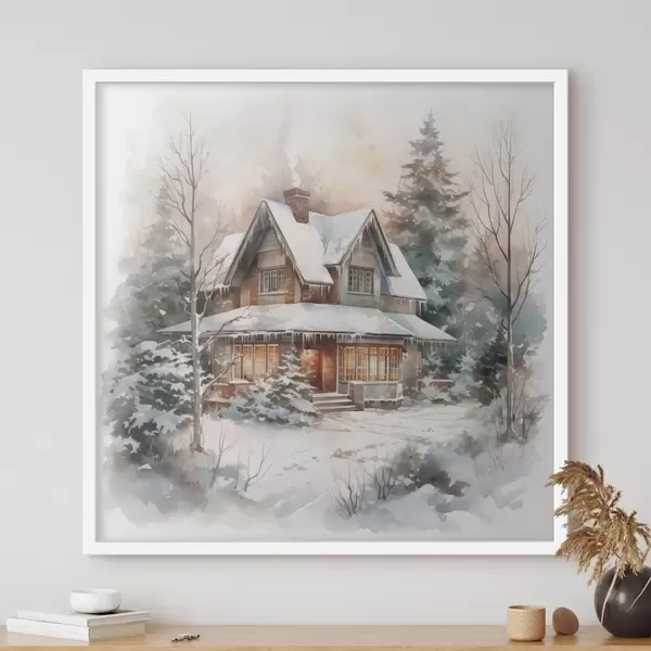 Affiche Maison dans une forêt enneigée imitation aquarelle Non f42137