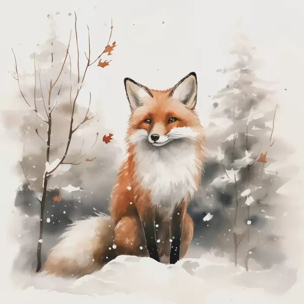 Affiche Renardeau dans une forêt enneigée imitation aquarelle f42146
