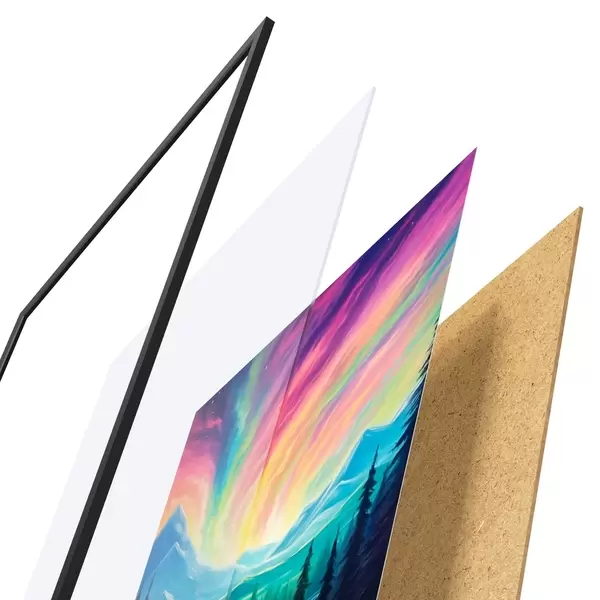 Le poster se compose d'un cadre, d'un plexiglas, d'une image imprimée et d'un support en aggloméré. Le poster peut être immédiatement accroché au mur grâce aux fixations au dos.