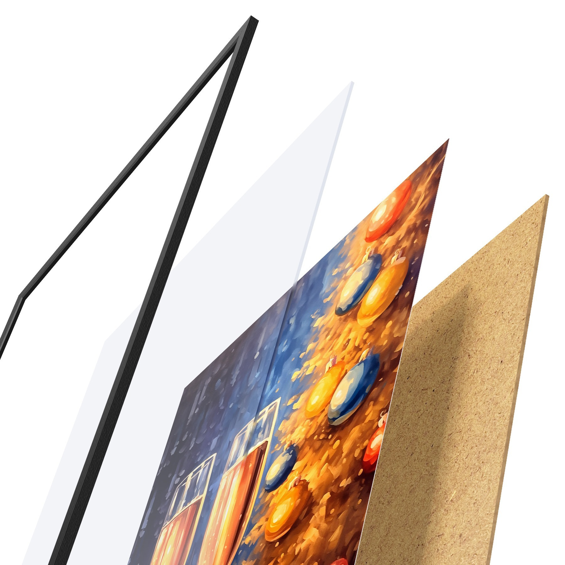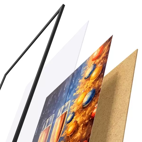 Le poster se compose d'un cadre, d'un plexiglas, d'une image imprimée et d'un support en aggloméré. Le poster peut être immédiatement accroché au mur grâce aux fixations au dos.