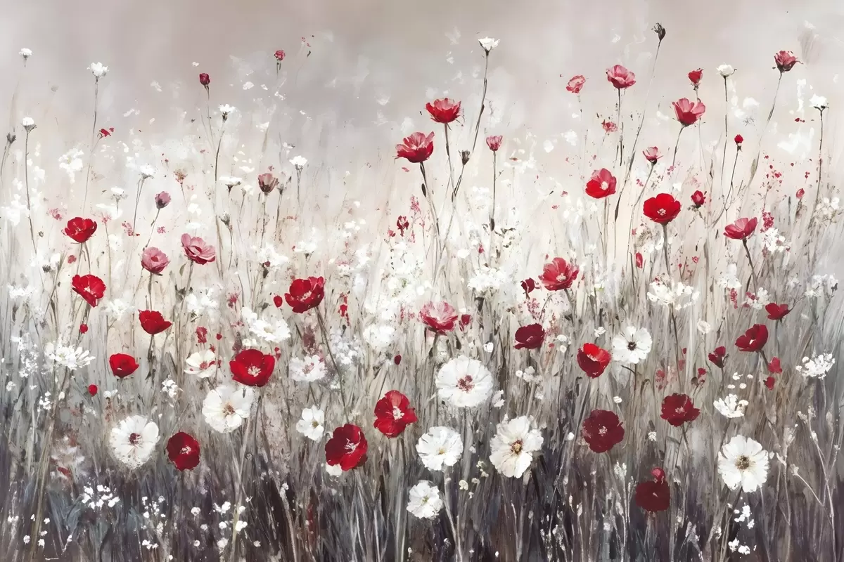 Affiche Imitation abstraite de peinture à l'huile d'un champ de coquelicots et de marguerites rouges et blancs sur un fond texturé gris Non f42213