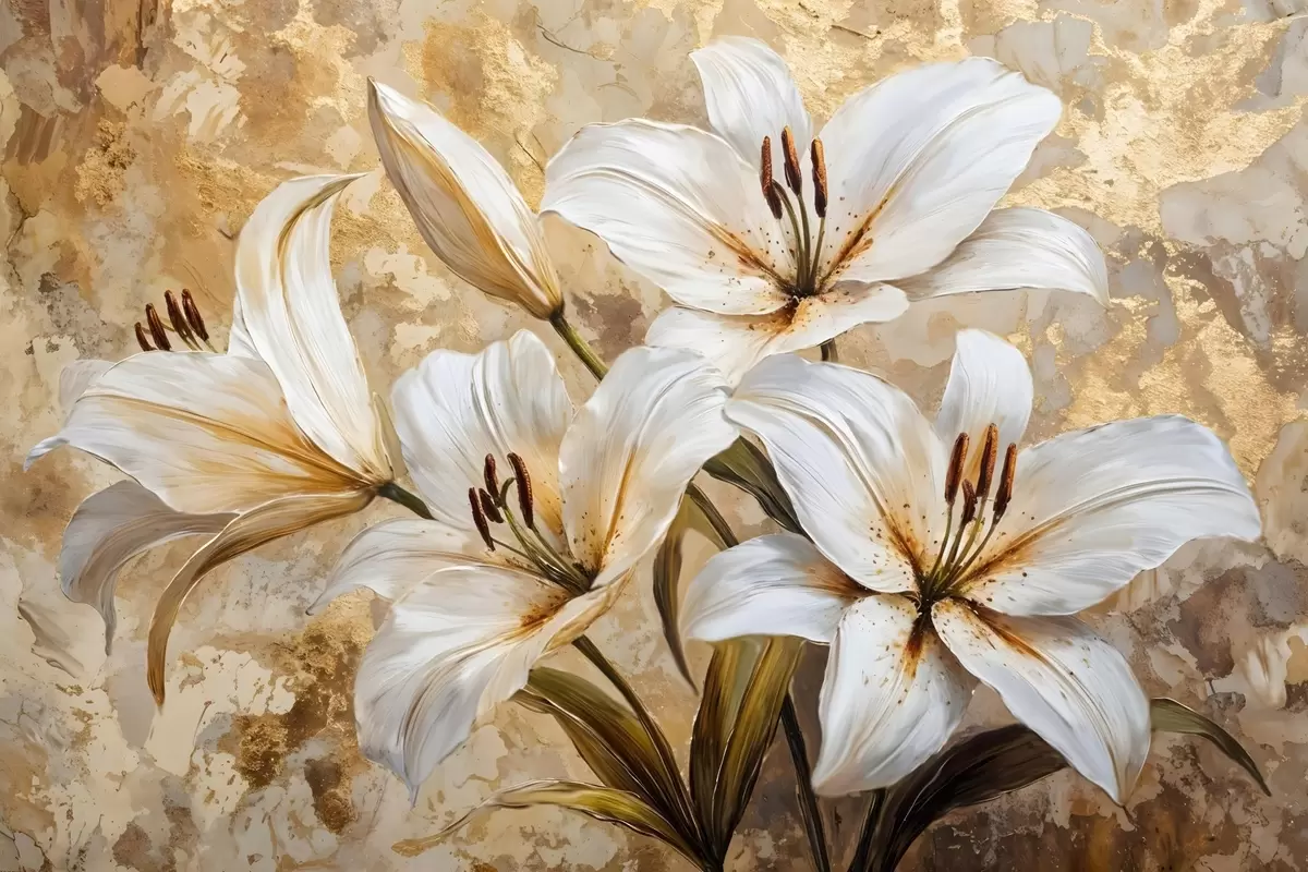 Affiche Lys blancs avec centre jaune sur fond beige texturé f42216