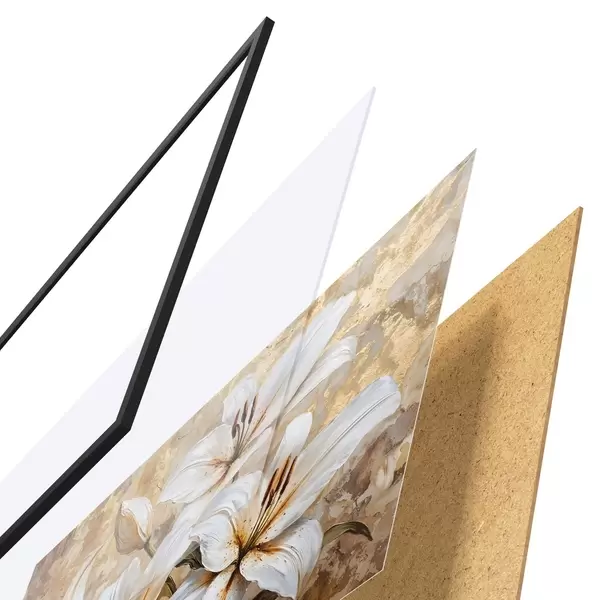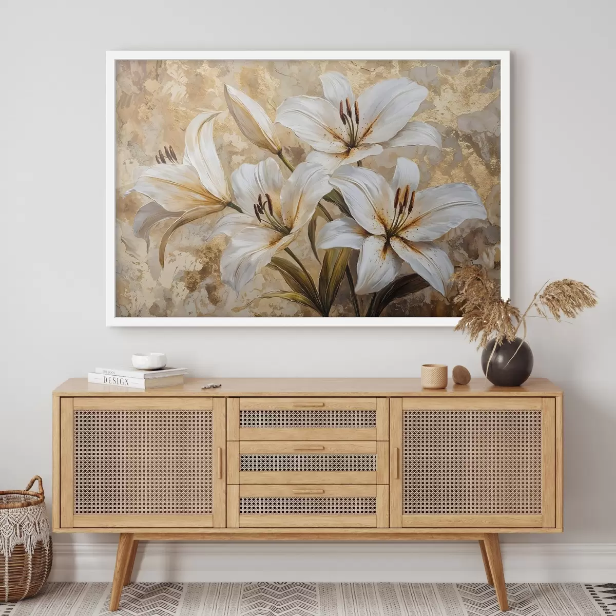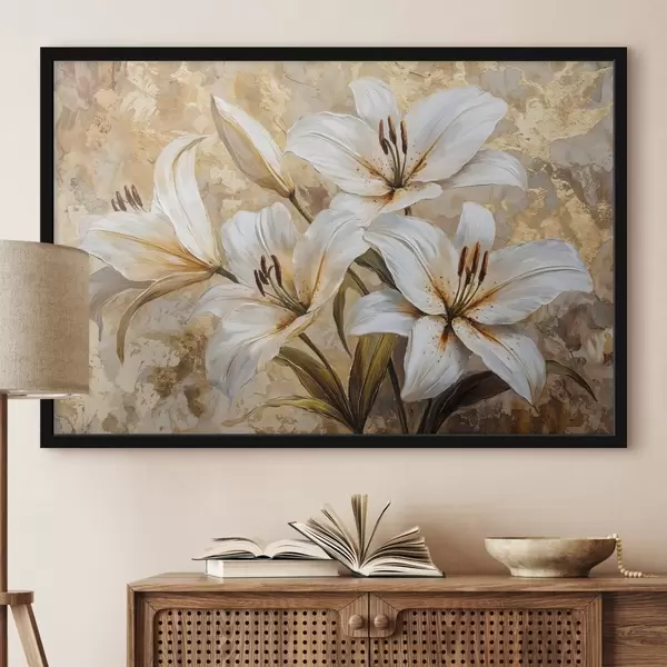 Affiche Lys blancs avec centre jaune sur fond beige texturé Non f42216