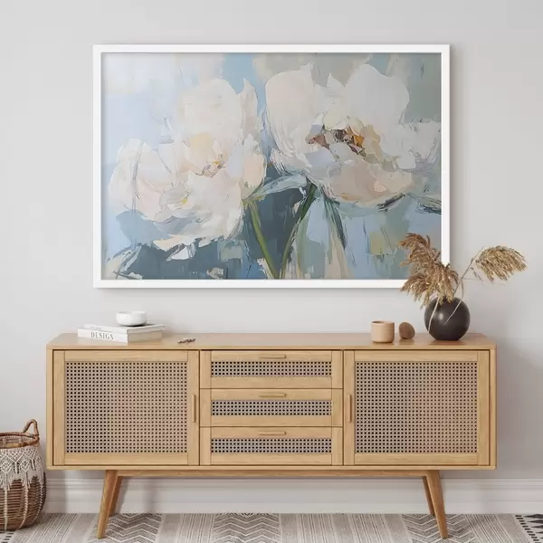 Affiche Peinture à l'huile abstraite minimaliste blanche imitant les pivoines sur un fond bleu doux f42226
