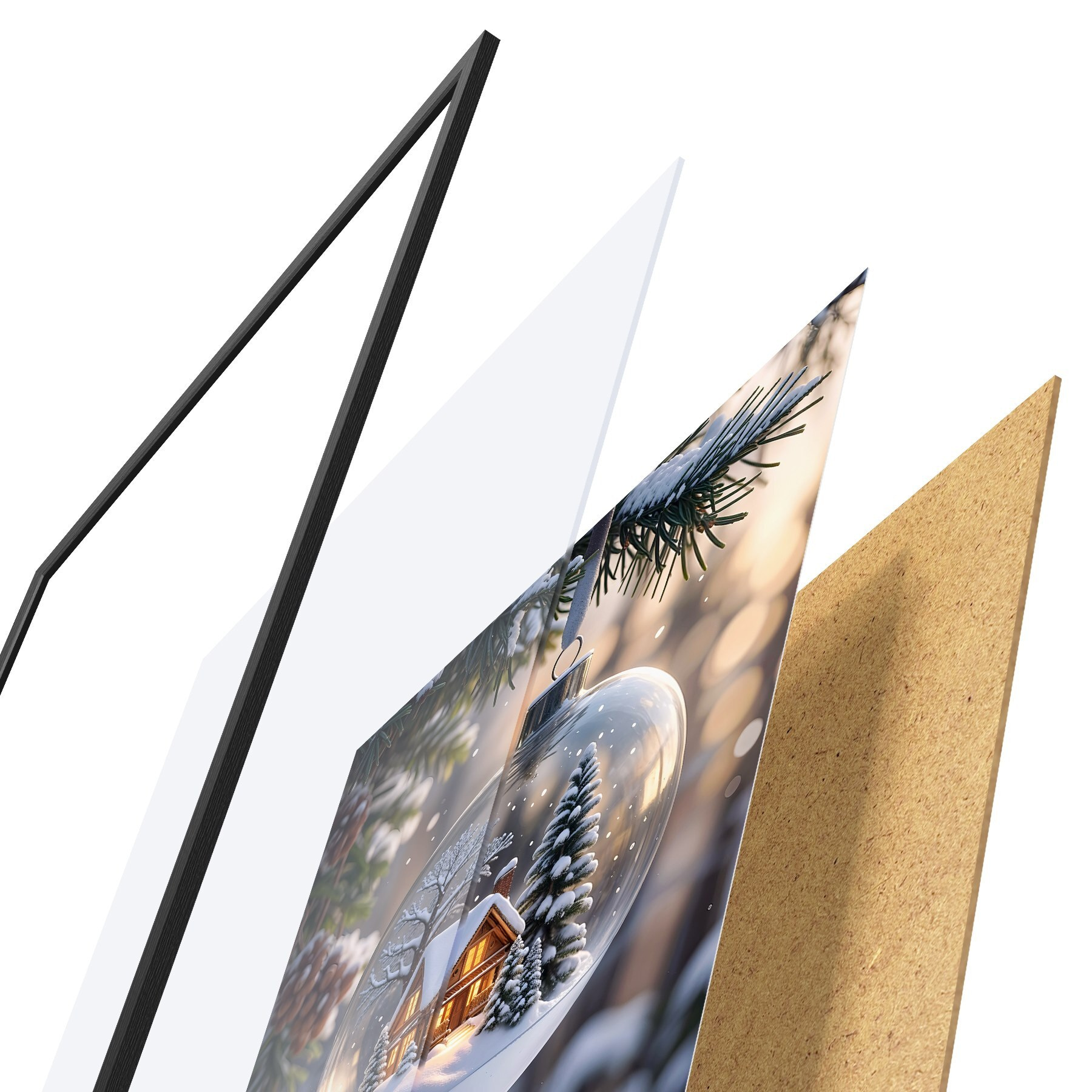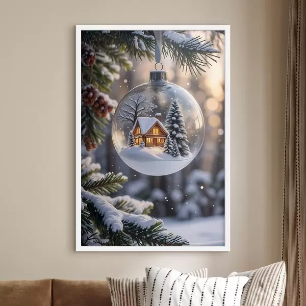 Affiche Globe de Noël en verre avec un paysage hivernal enneigé à l'intérieur, représentant une cabane confortable dans les bois avec des pins Non f42236
