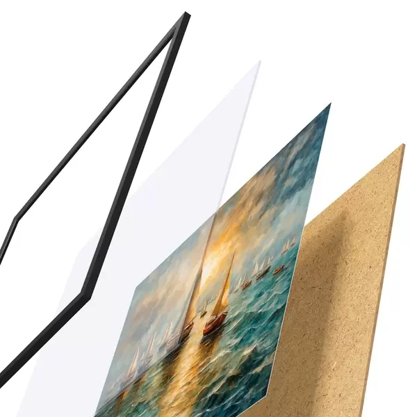 Le poster se compose d'un cadre, d'un plexiglas, d'une image imprimée et d'un support en aggloméré. Le poster peut être immédiatement accroché au mur grâce aux fixations au dos.