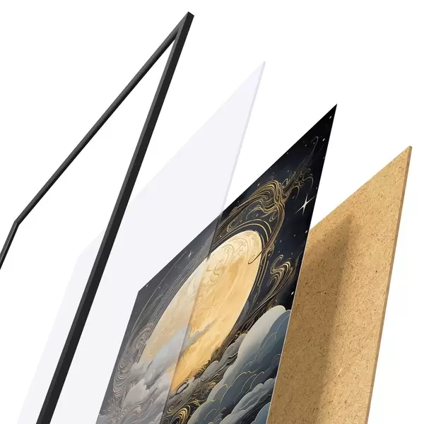 Le poster se compose d'un cadre, d'un plexiglas, d'une image imprimée et d'un support en aggloméré. Le poster peut être immédiatement accroché au mur grâce aux fixations au dos.