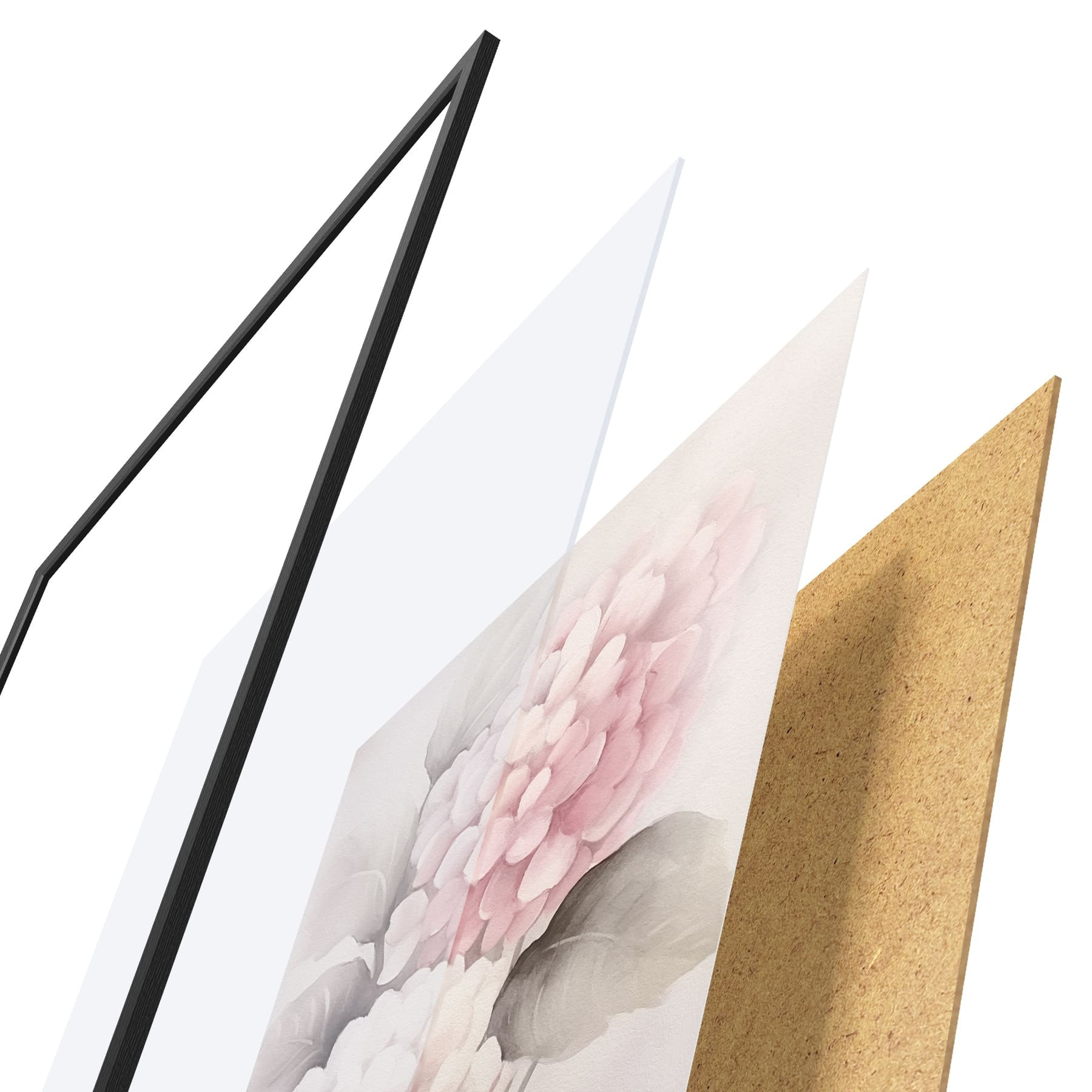 Le poster se compose d'un cadre, d'un plexiglas, d'une image imprimée et d'un support en aggloméré. Le poster peut être immédiatement accroché au mur grâce aux fixations au dos.