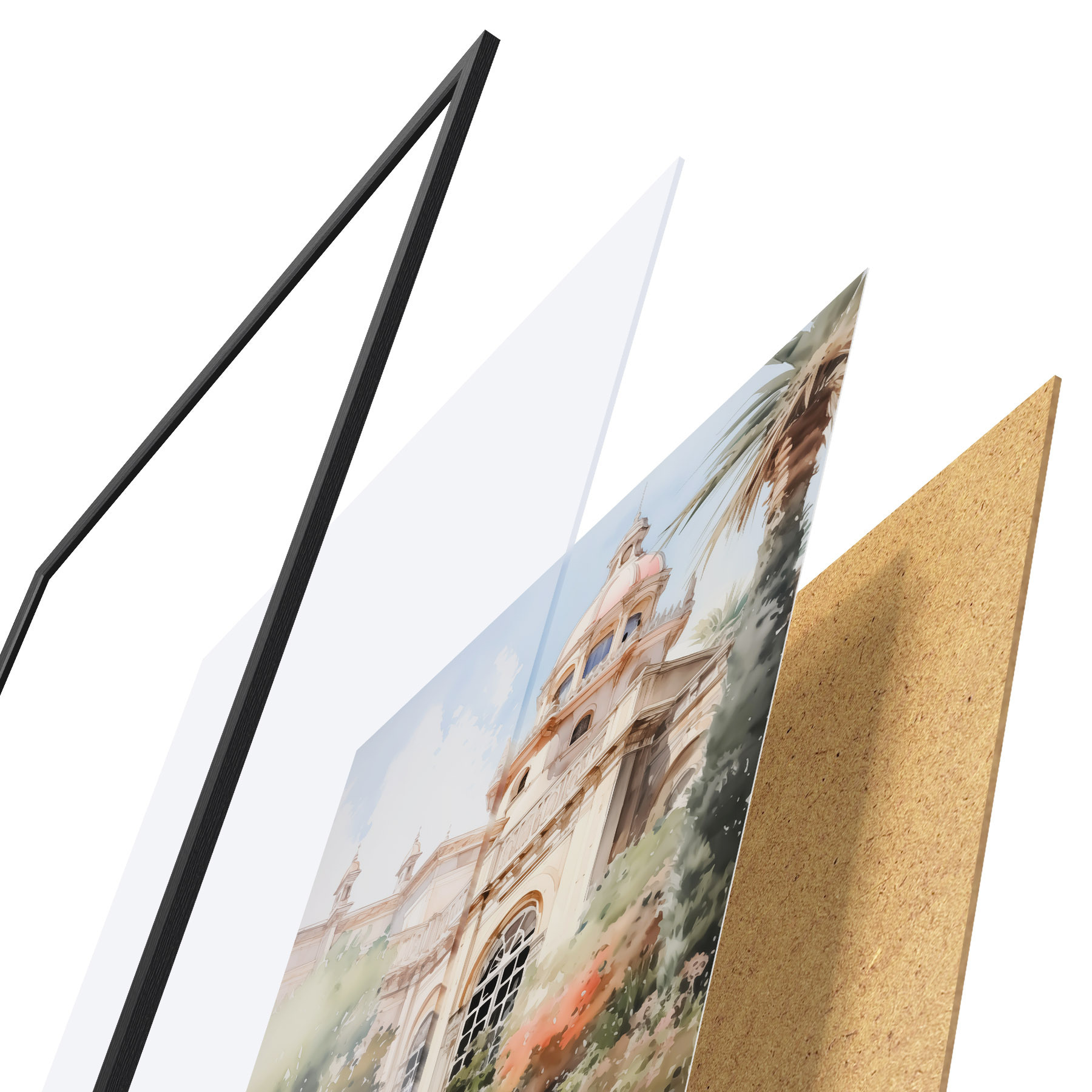 Le poster se compose d'un cadre, d'un plexiglas, d'une image imprimée et d'un support en aggloméré. Le poster peut être immédiatement accroché au mur grâce aux fixations au dos.