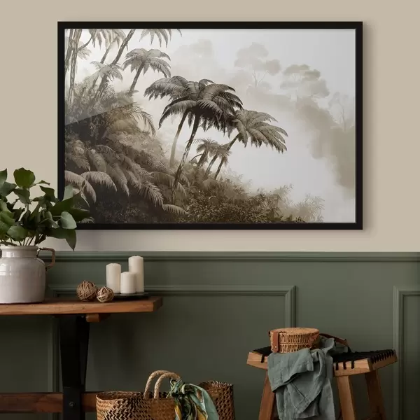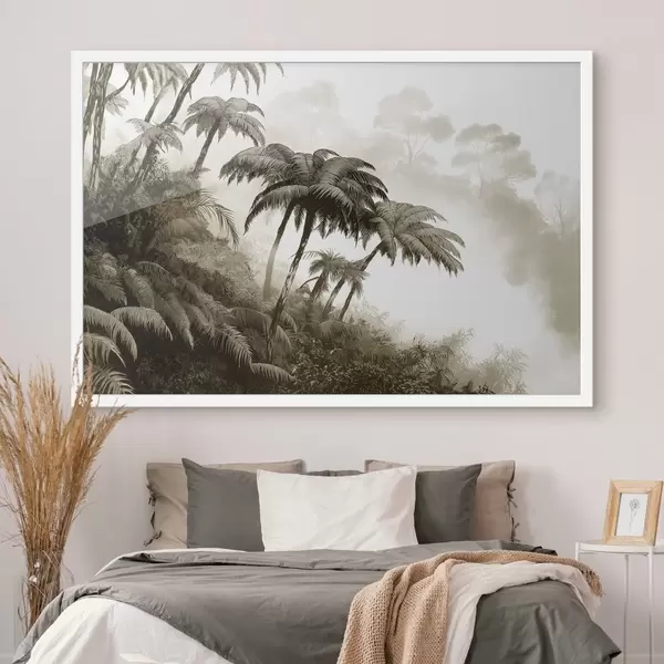 Affiche Forêt de jungle dans la brume, palmiers, nature, couleurs beiges Non f42372