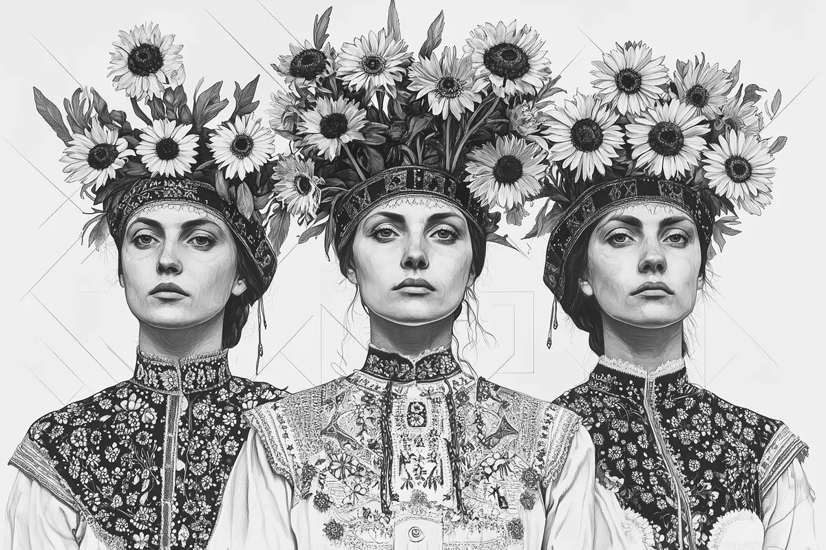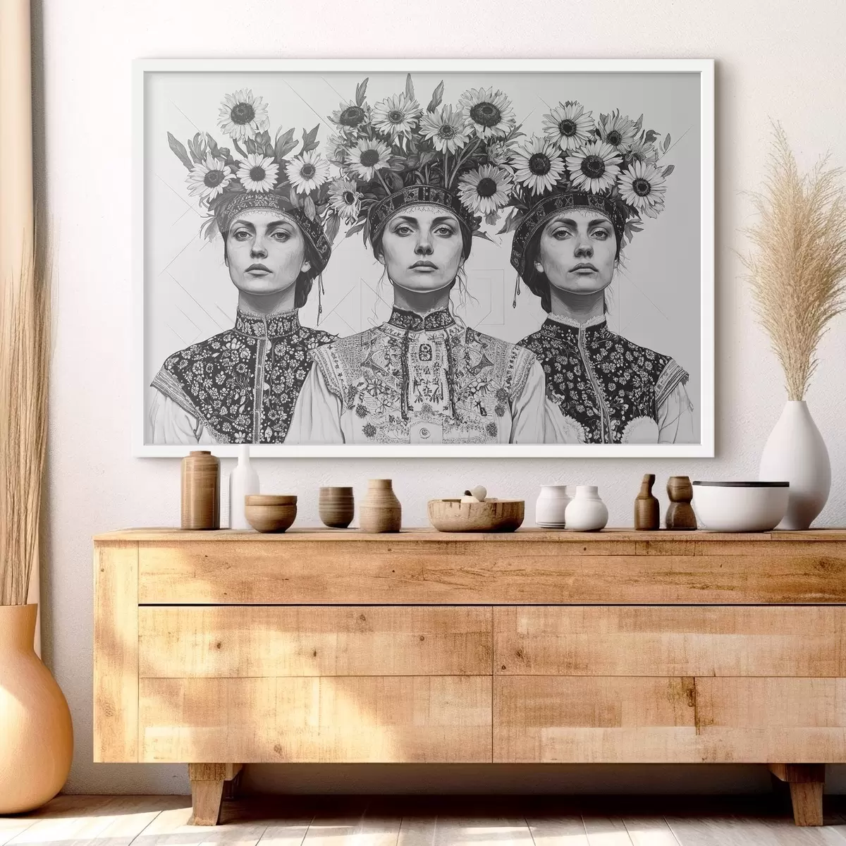 Affiche Femmes ukrainiennes en tenues ethniques avec des couronnes de fleurs Non f42379
