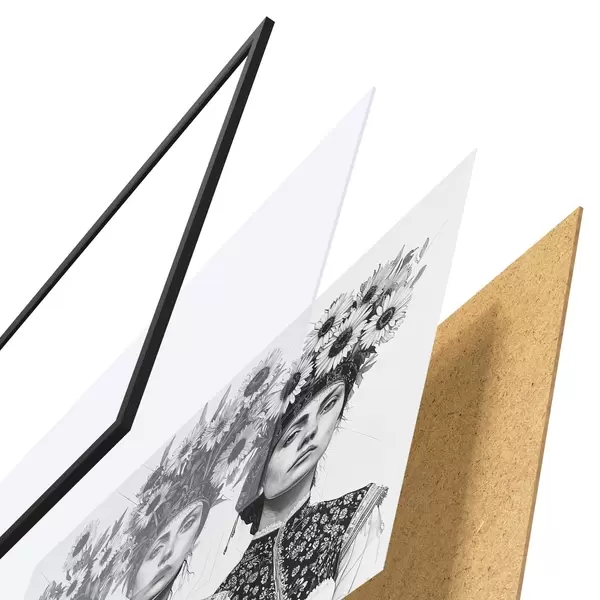 Le poster se compose d'un cadre, d'un plexiglas, d'une image imprimée et d'un support en aggloméré. Le poster peut être immédiatement accroché au mur grâce aux fixations au dos.