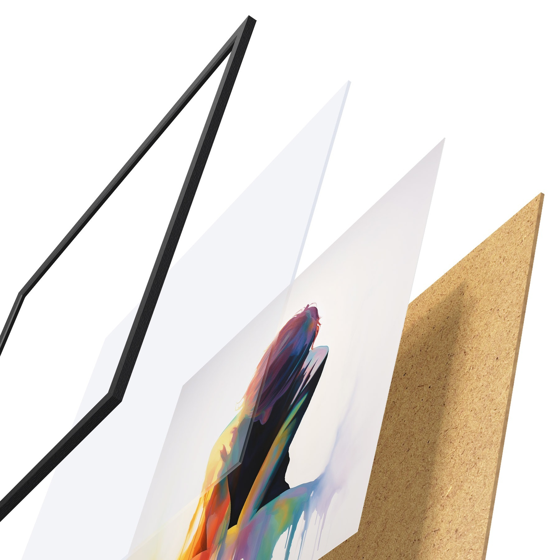 Le poster se compose d'un cadre, d'un plexiglas, d'une image imprimée et d'un support en aggloméré. Le poster peut être immédiatement accroché au mur grâce aux fixations au dos.