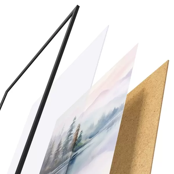 Le poster se compose d'un cadre, d'un plexiglas, d'une image imprimée et d'un support en aggloméré. Le poster peut être immédiatement accroché au mur grâce aux fixations au dos.