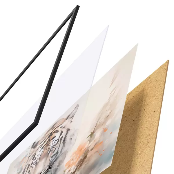 Le poster se compose d'un cadre, d'un plexiglas, d'une image imprimée et d'un support en aggloméré. Le poster peut être immédiatement accroché au mur grâce aux fixations au dos.