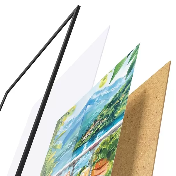 Le poster se compose d'un cadre, d'un plexiglas, d'une image imprimée et d'un support en aggloméré. Le poster peut être immédiatement accroché au mur grâce aux fixations au dos.