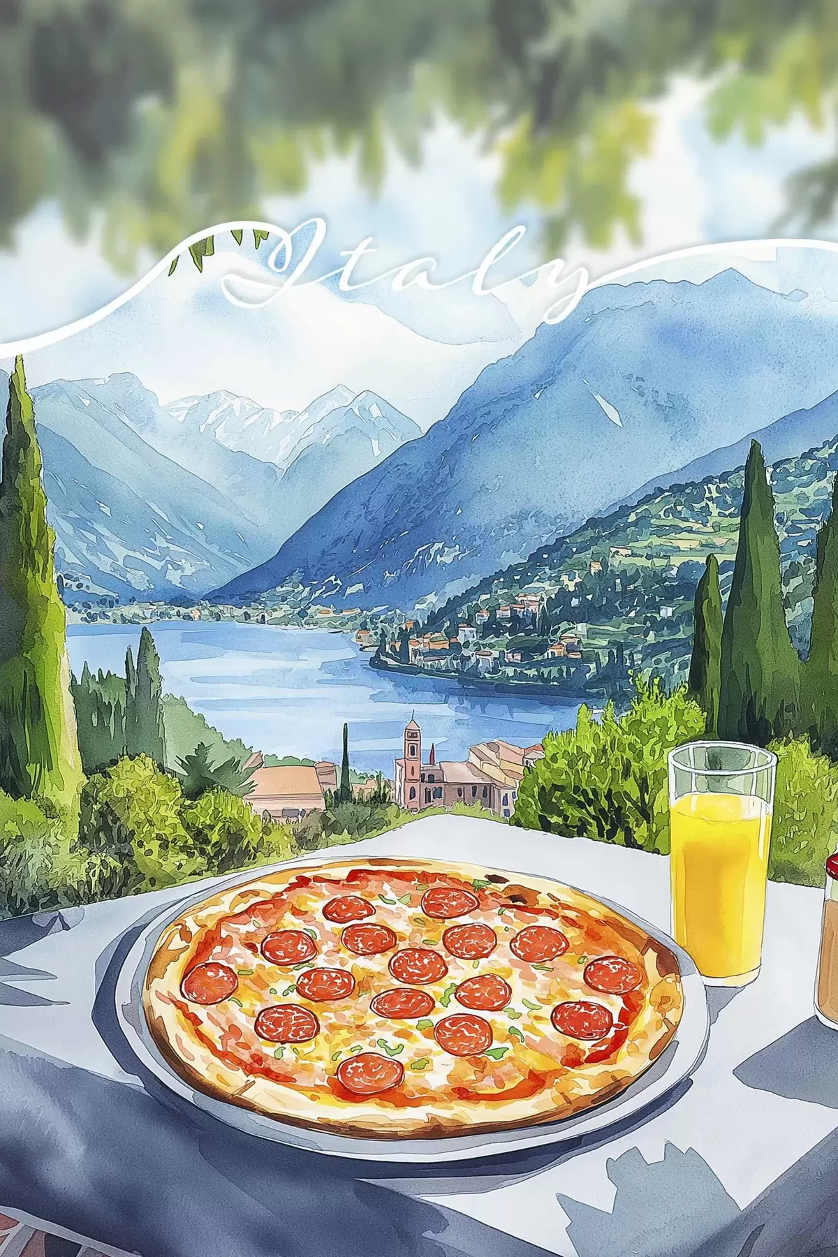 Affiche Aquarelle, Italie, pizza, vieille ville, paysage de montagne Non f42435