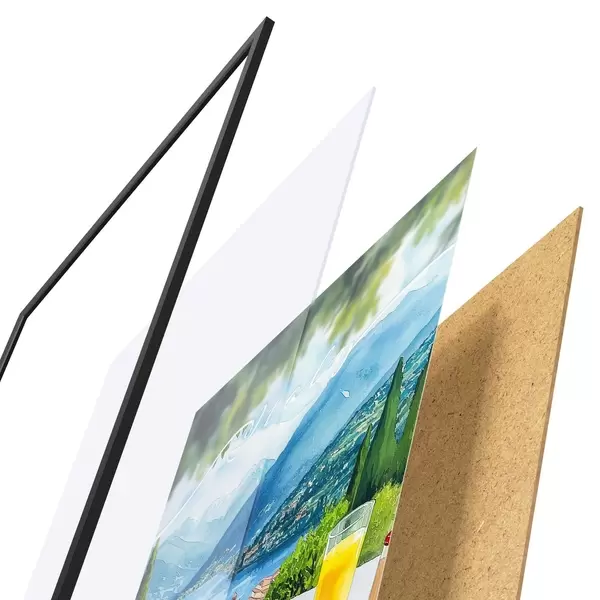 Le poster se compose d'un cadre, d'un plexiglas, d'une image imprimée et d'un support en aggloméré. Le poster peut être immédiatement accroché au mur grâce aux fixations au dos.