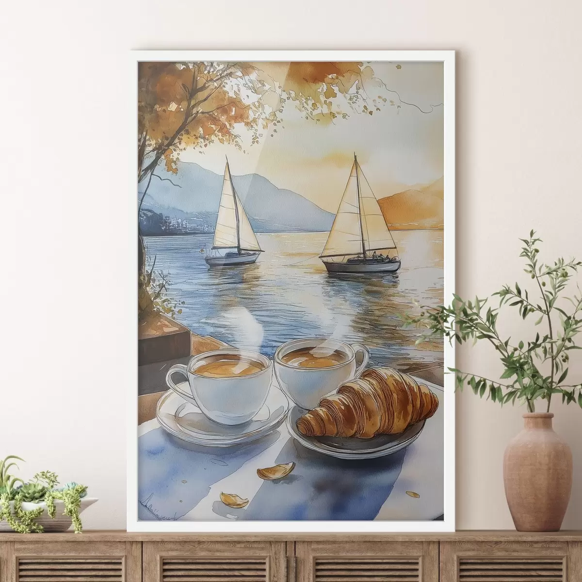 Affiche Coucher de soleil sur le lac, voiliers, tasses de café, style aquarelle Non f42442