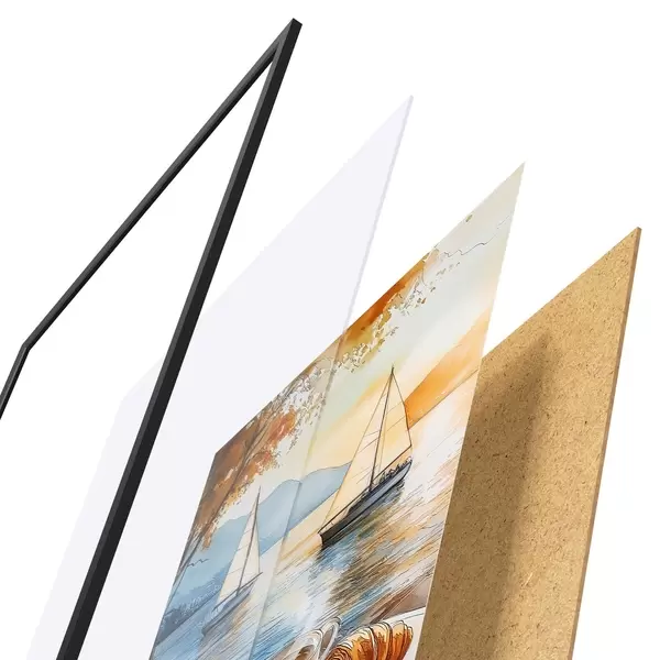 Le poster se compose d'un cadre, d'un plexiglas, d'une image imprimée et d'un support en aggloméré. Le poster peut être immédiatement accroché au mur grâce aux fixations au dos.