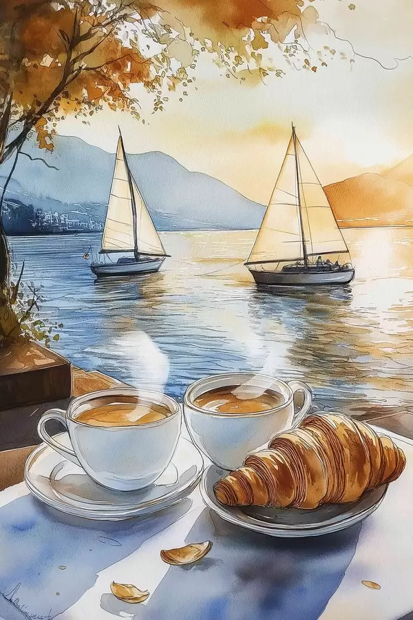 Affiche Coucher de soleil sur le lac, voiliers, tasses de café, style aquarelle Non f42442