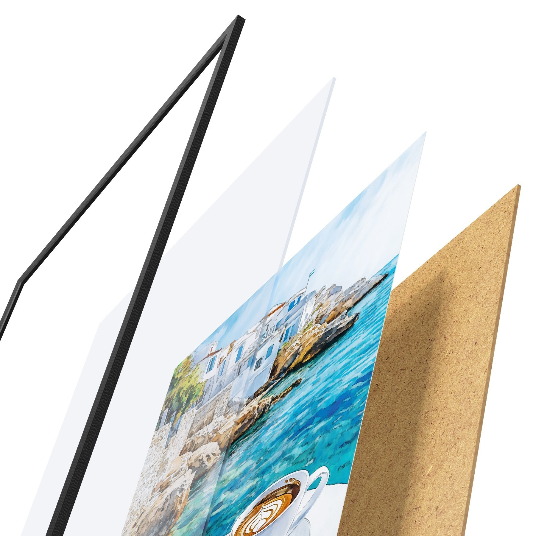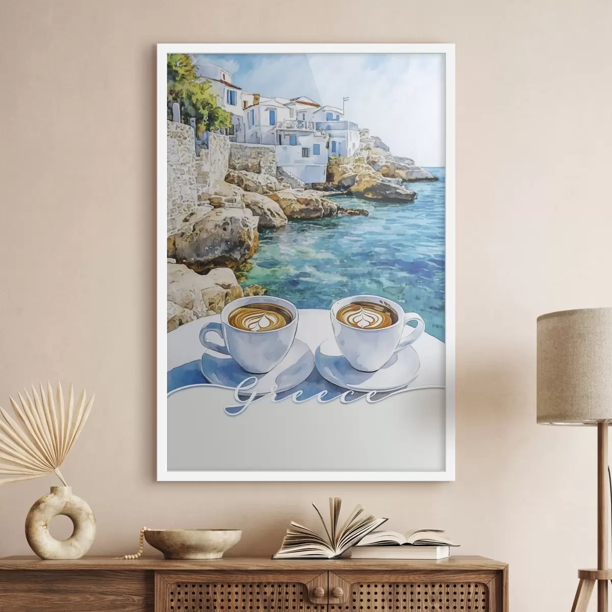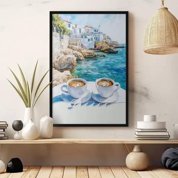 Affiche Grèce esthétique, tasses de café, mer bleue, vieille ville, voyage Non f42447