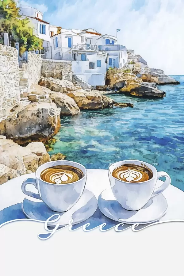 Affiche Grèce esthétique, tasses de café, mer bleue, vieille ville, voyage Non f42447