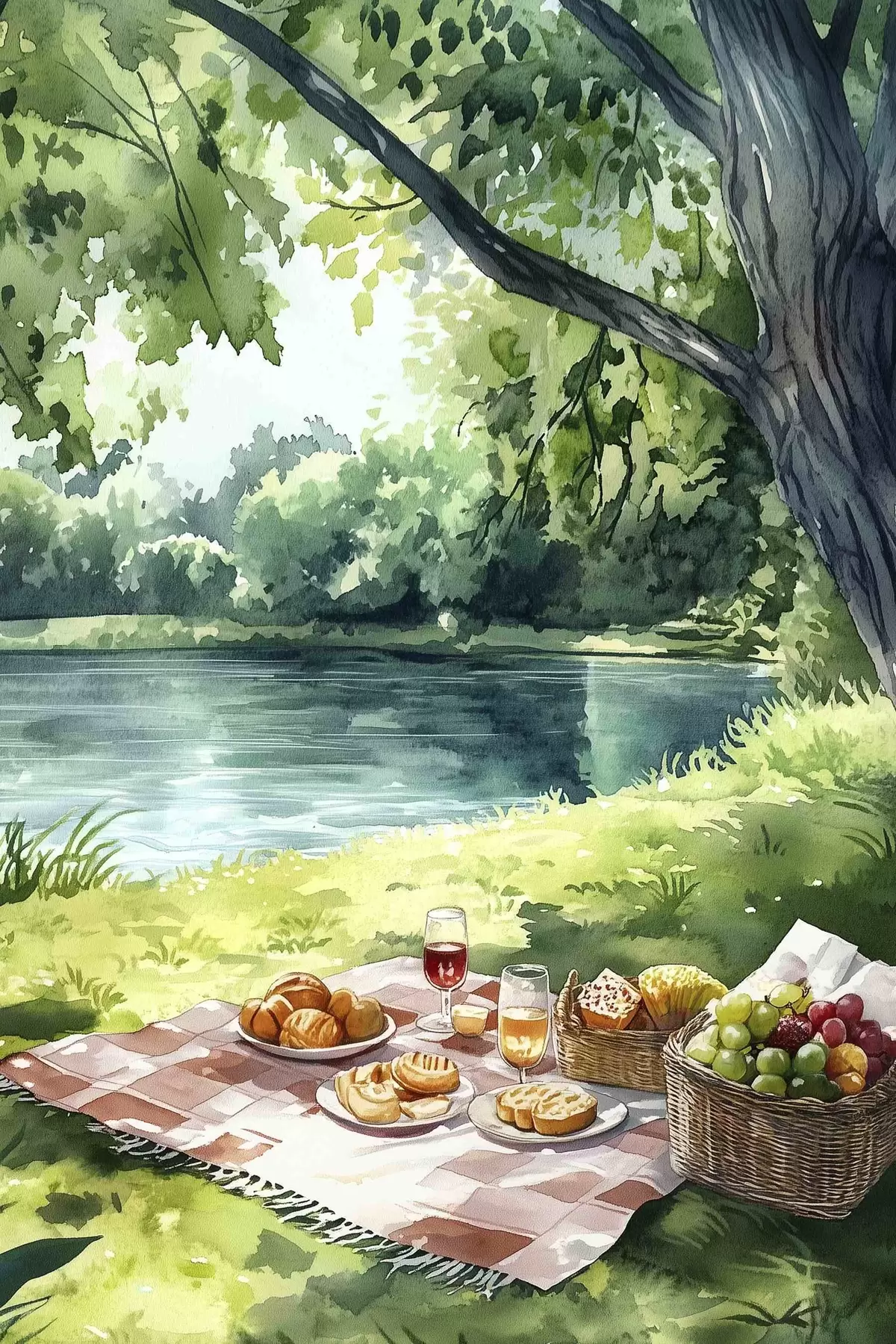 Affiche Beau pique-nique romantique au bord d'un lac d'été, fruits, verdure Non f42451