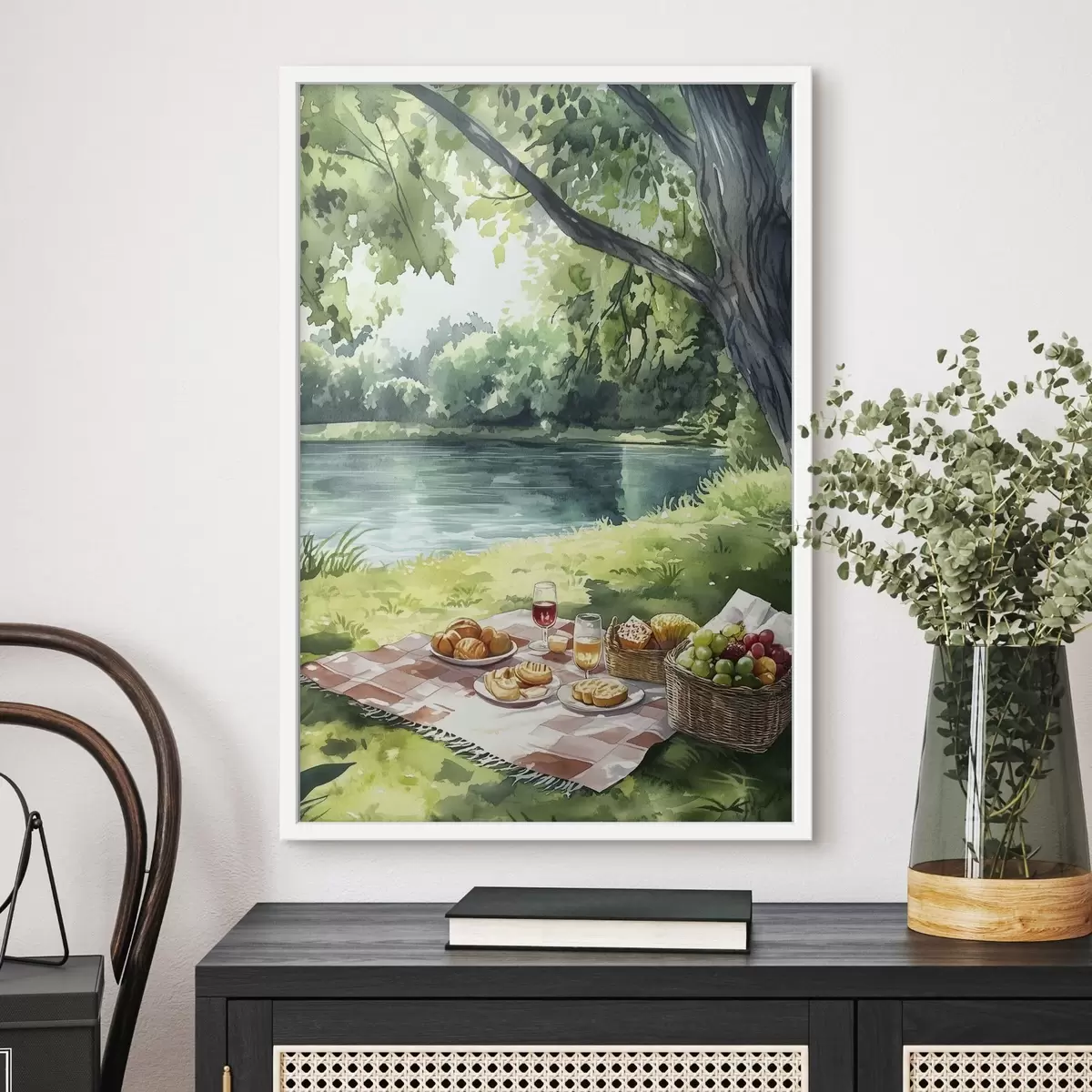 Affiche Beau pique-nique romantique au bord d'un lac d'été, fruits, verdure f42451