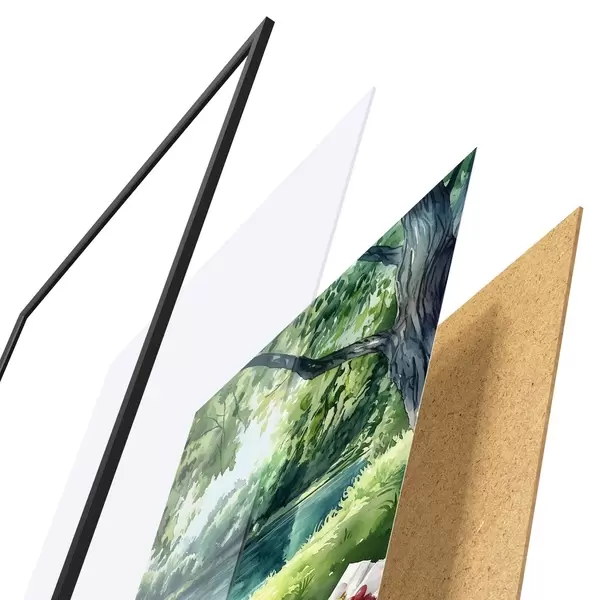 Le poster se compose d'un cadre, d'un plexiglas, d'une image imprimée et d'un support en aggloméré. Le poster peut être immédiatement accroché au mur grâce aux fixations au dos.