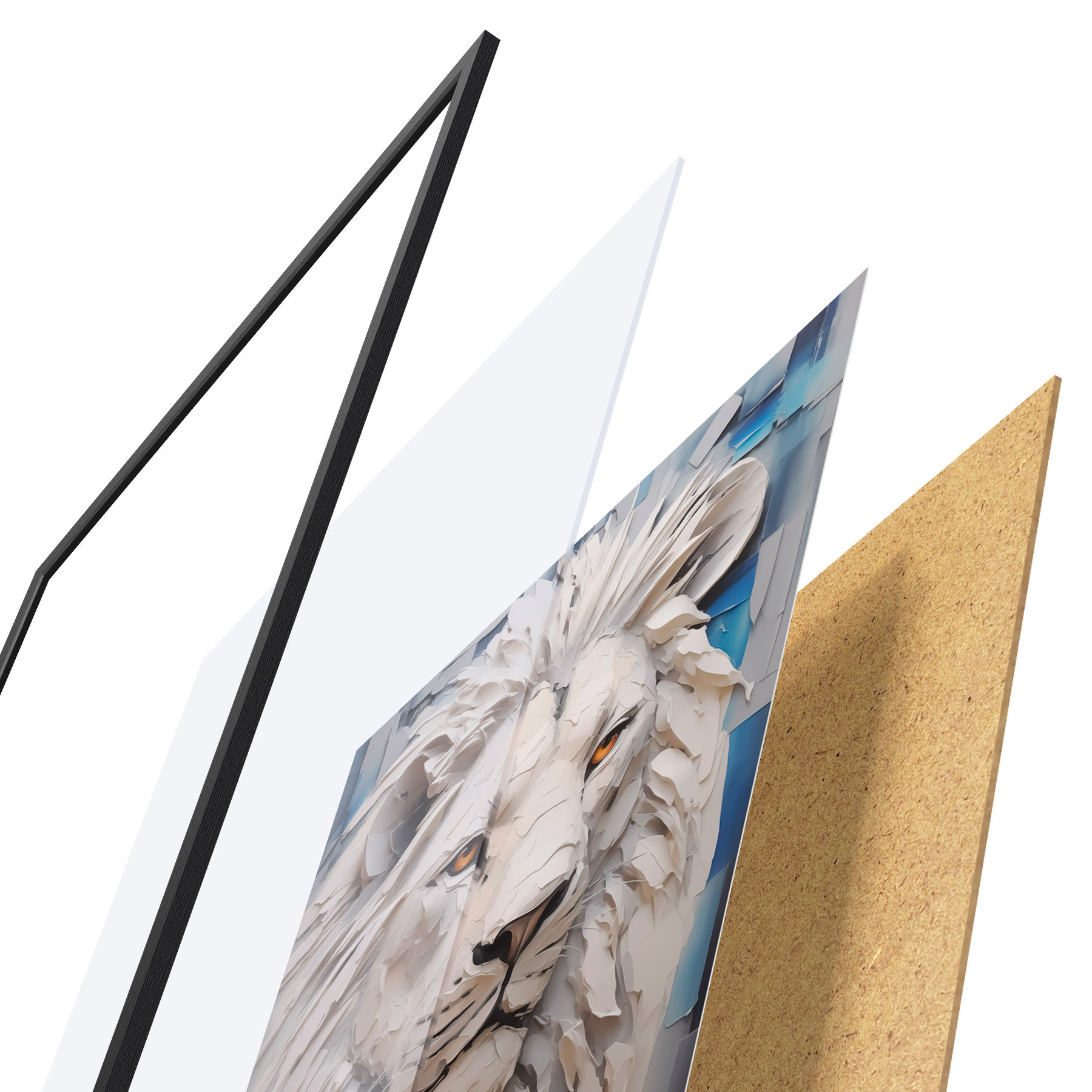 Le poster se compose d'un cadre, d'un plexiglas, d'une image imprimée et d'un support en aggloméré. Le poster peut être immédiatement accroché au mur grâce aux fixations au dos.