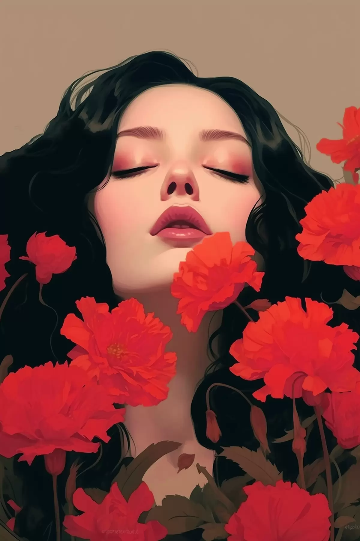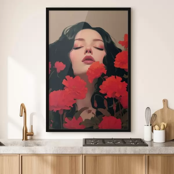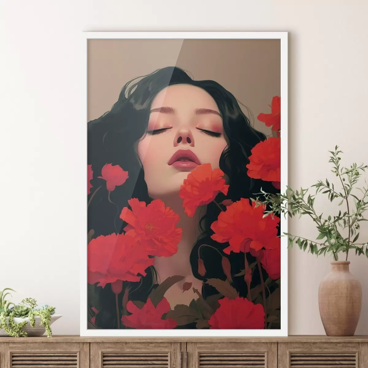 Affiche Portrait de femme parmi des fleurs rouges Non f42478