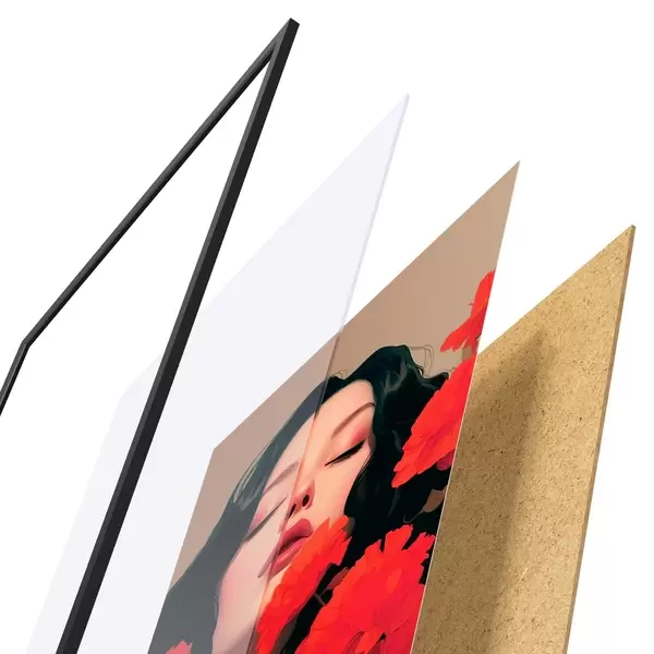Le poster se compose d'un cadre, d'un plexiglas, d'une image imprimée et d'un support en aggloméré. Le poster peut être immédiatement accroché au mur grâce aux fixations au dos.