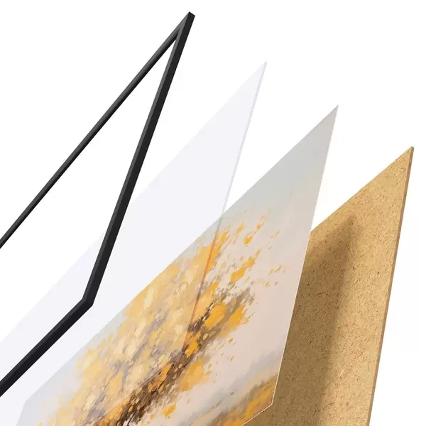 Le poster se compose d'un cadre, d'un plexiglas, d'une image imprimée et d'un support en aggloméré. Le poster peut être immédiatement accroché au mur grâce aux fixations au dos.