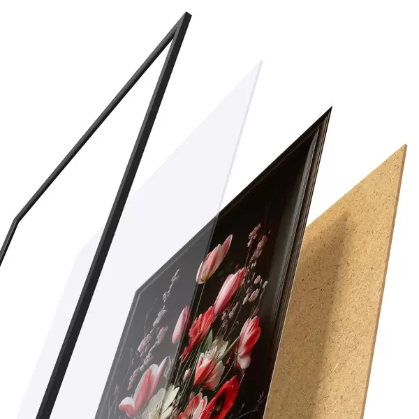 Le poster se compose d'un cadre, d'un plexiglas, d'une image imprimée et d'un support en aggloméré. Le poster peut être immédiatement accroché au mur grâce aux fixations au dos.