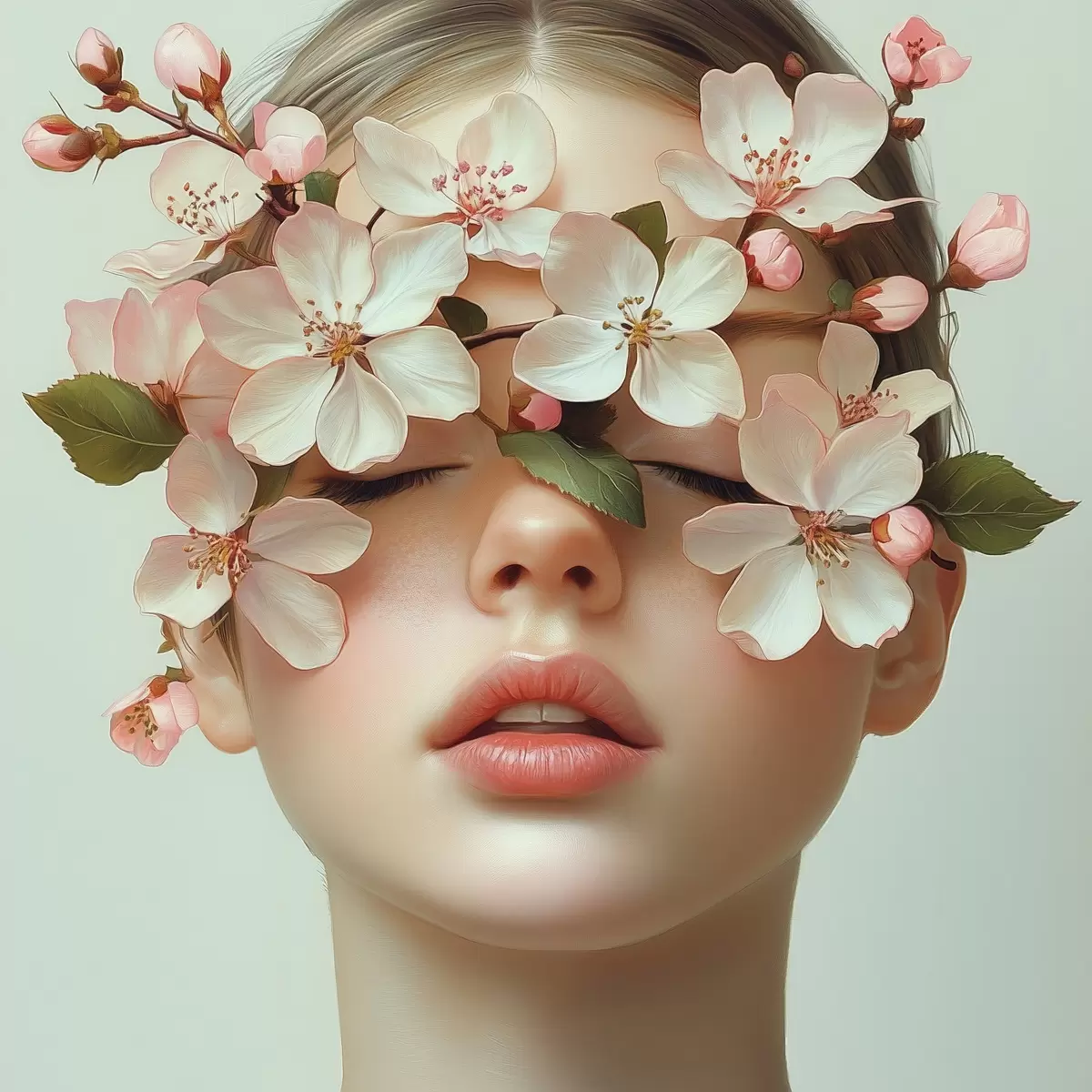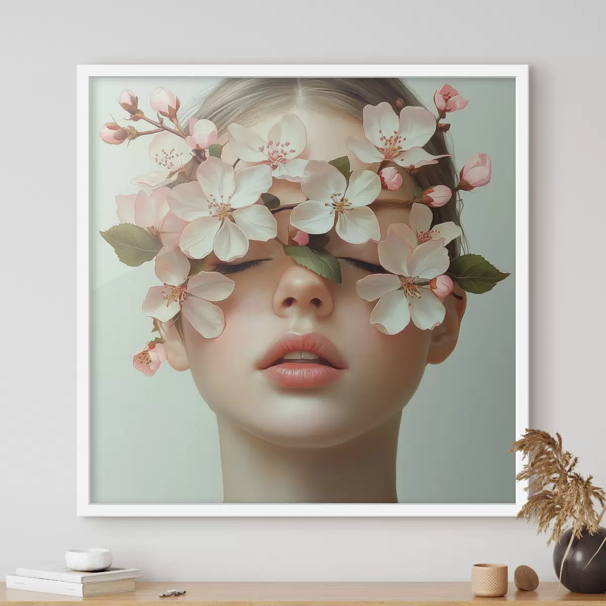 Affiche Portrait d'une jeune fille avec des fleurs sur le visage Non f42506