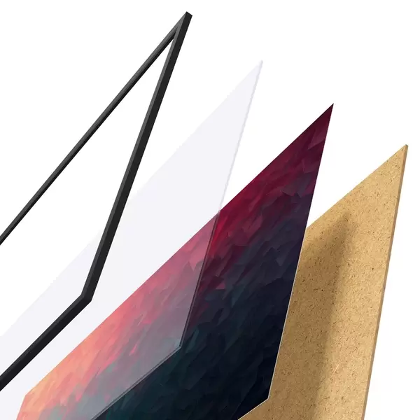 Le poster se compose d'un cadre, d'un plexiglas, d'une image imprimée et d'un support en aggloméré. Le poster peut être immédiatement accroché au mur grâce aux fixations au dos.