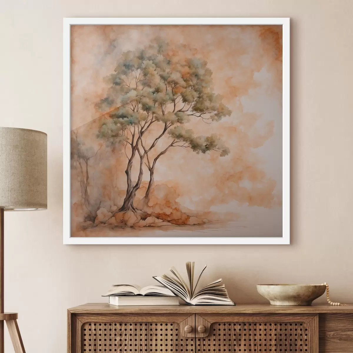 Affiche Arbre sur fond orange et blanc dans le style aquarelle Non f42514