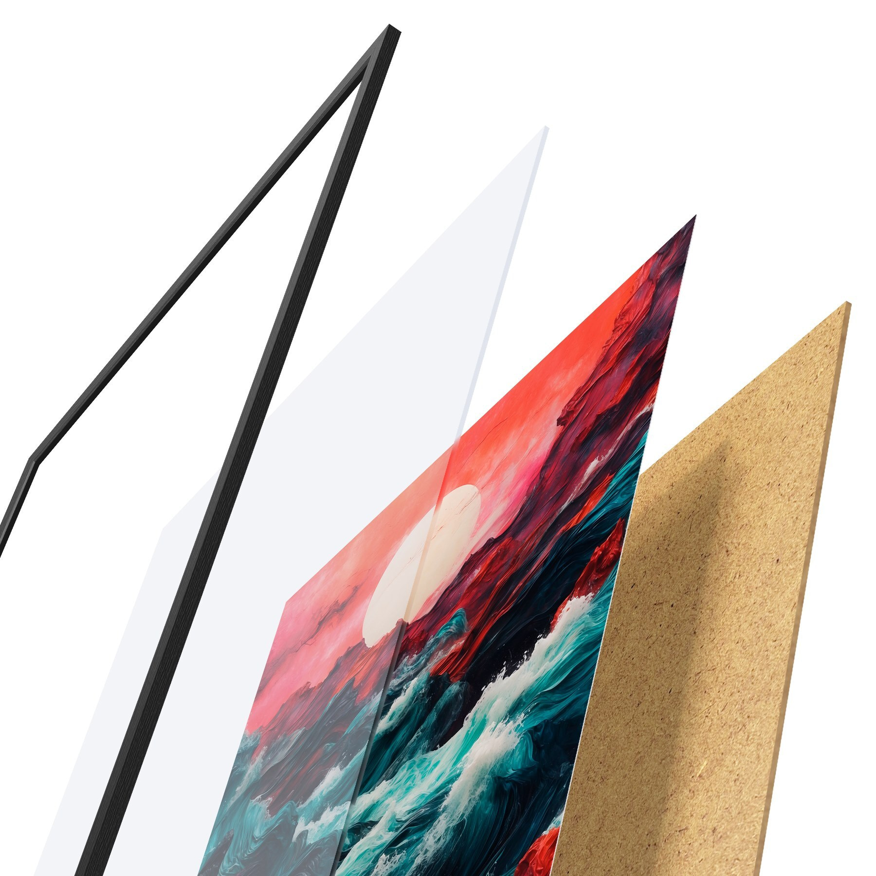 Le poster se compose d'un cadre, d'un plexiglas, d'une image imprimée et d'un support en aggloméré. Le poster peut être immédiatement accroché au mur grâce aux fixations au dos.