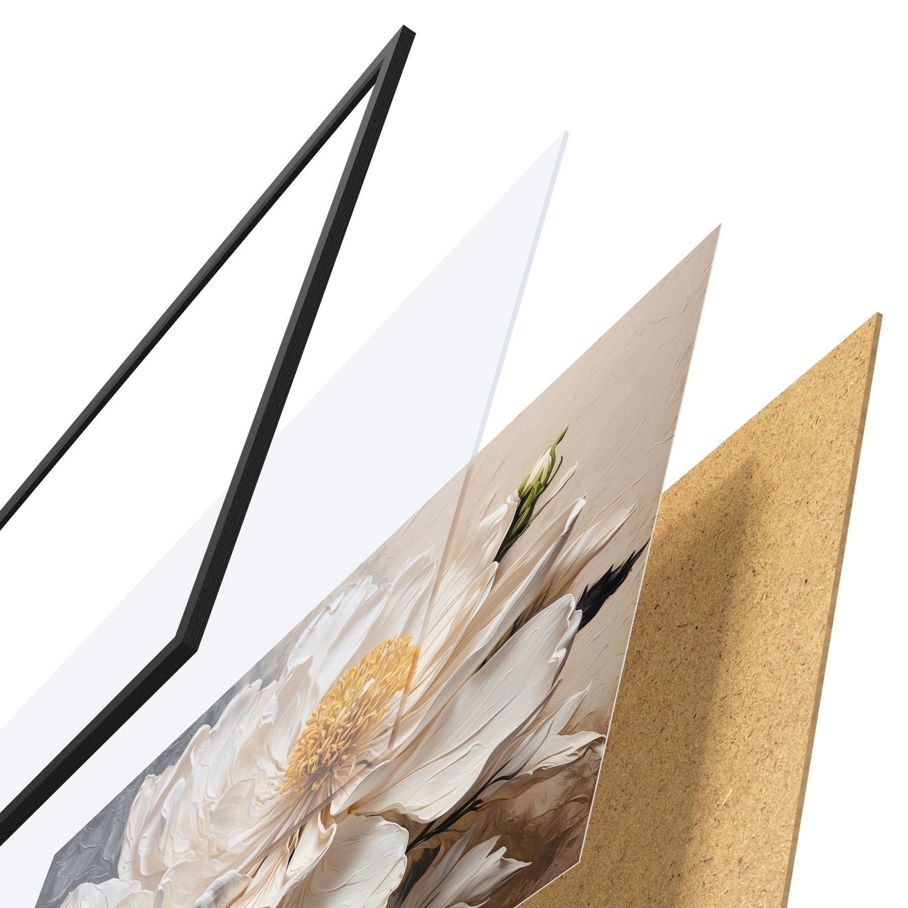 Le poster se compose d'un cadre, d'un plexiglas, d'une image imprimée et d'un support en aggloméré. Le poster peut être immédiatement accroché au mur grâce aux fixations au dos.
