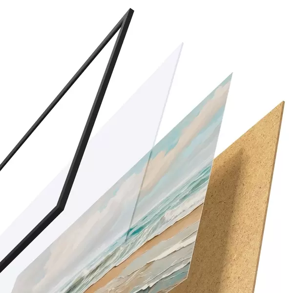 Le poster se compose d'un cadre, d'un plexiglas, d'une image imprimée et d'un support en aggloméré. Le poster peut être immédiatement accroché au mur grâce aux fixations au dos.