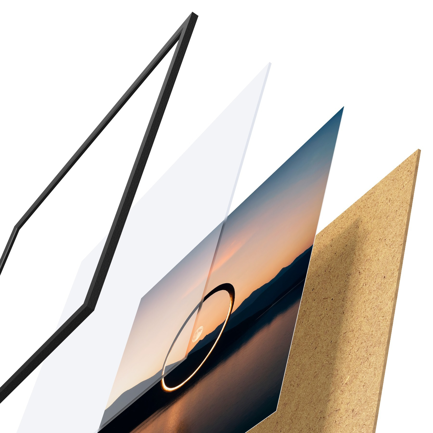 Le poster se compose d'un cadre, d'un plexiglas, d'une image imprimée et d'un support en aggloméré. Le poster peut être immédiatement accroché au mur grâce aux fixations au dos.