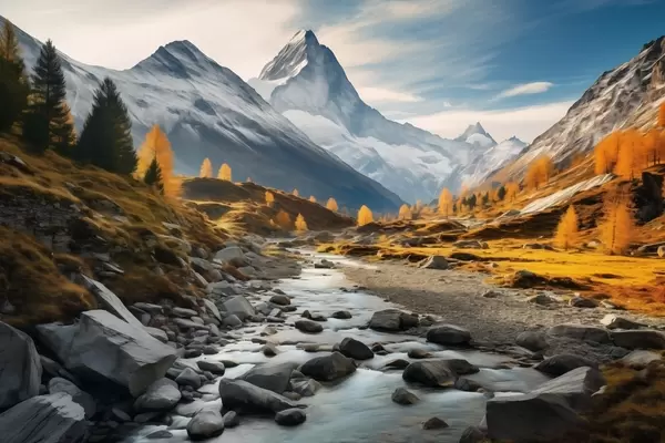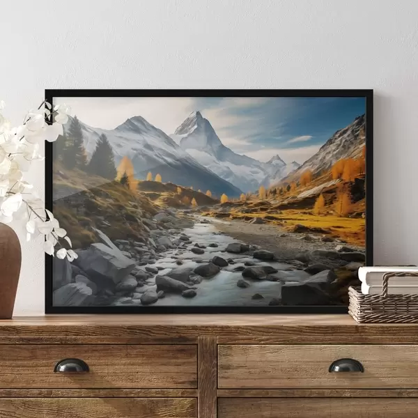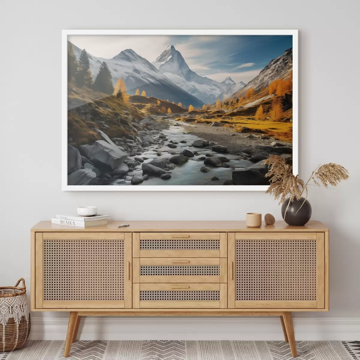 Affiche Paysage montagneux automnal avec une rivière tumultueuse, des arbres et un sommet majestueux sur fond de ciel clair. f42564