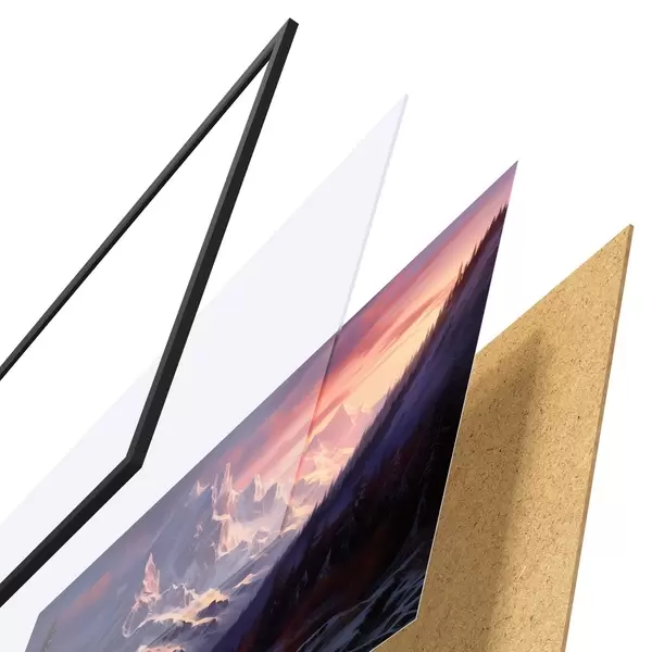 Le poster se compose d'un cadre, d'un plexiglas, d'une image imprimée et d'un support en aggloméré. Le poster peut être immédiatement accroché au mur grâce aux fixations au dos.