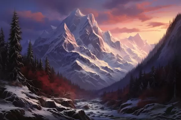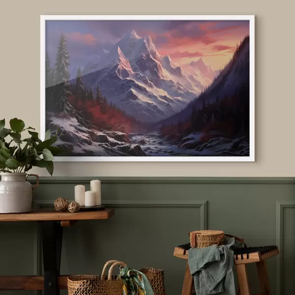 Affiche Un paysage de montagne à couper le souffle au coucher du soleil, avec des sommets enneigés, des pins sombres et de douces teintes rose-violet dans le ciel. f42566