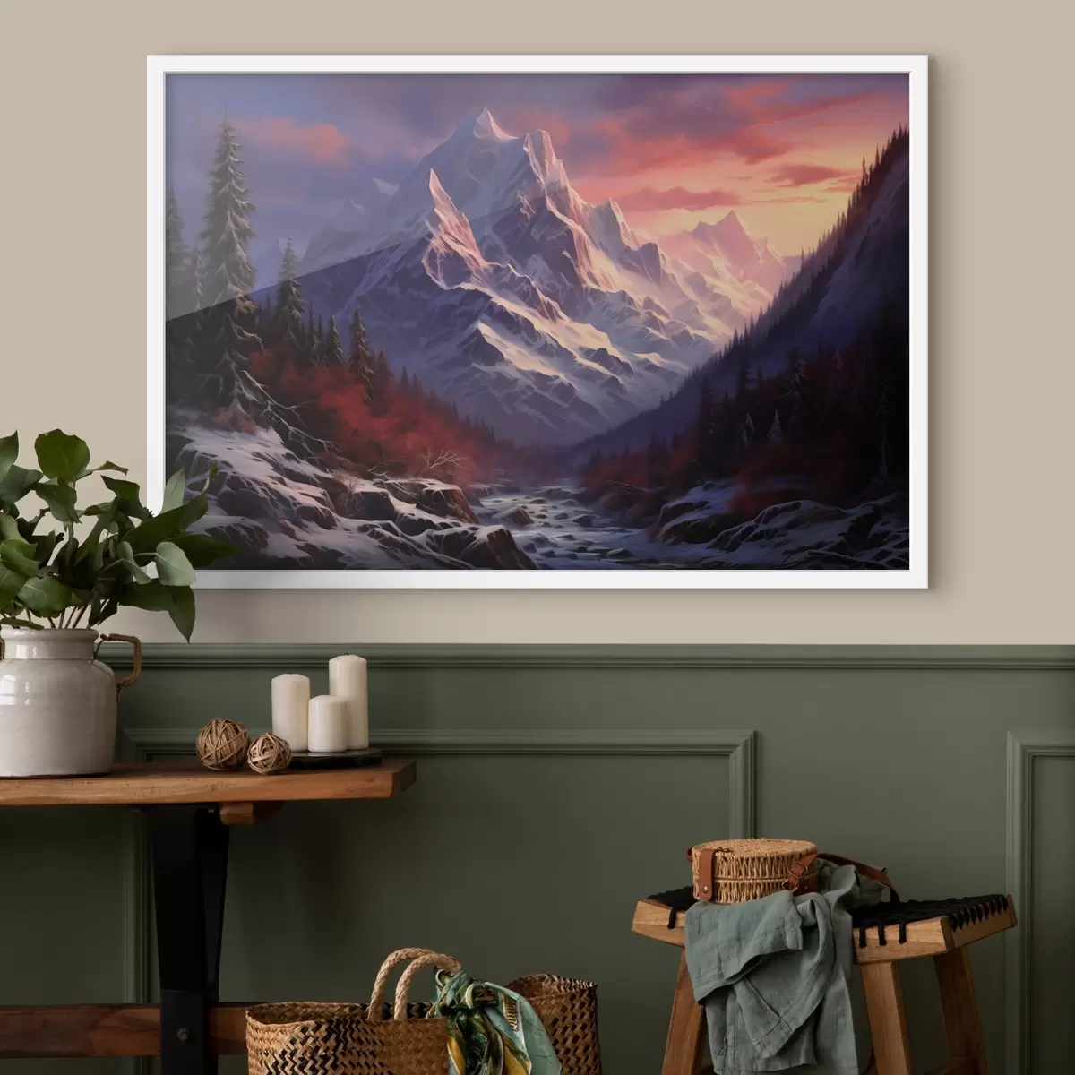 Affiche Un paysage de montagne à couper le souffle au coucher du soleil, avec des sommets enneigés, des pins sombres et de douces teintes rose-violet dans le ciel. Non f42566