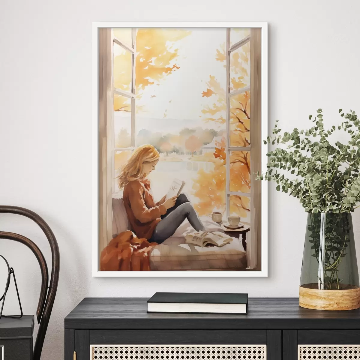 Affiche Une jeune fille lit un livre près d'une fenêtre ouverte dans un décor automnal, avec des arbres clairs en arrière-plan et une tasse de thé à proximité. f42572