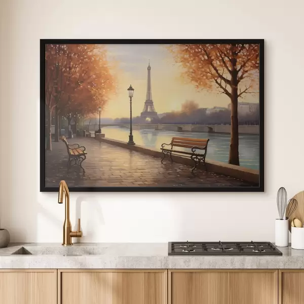 Affiche L'automne à Paris avec vue sur la tour Eiffel, les berges de la Seine recouvertes de feuilles, les bancs et les lampadaires qui ajoutent une touche romantique. f42577